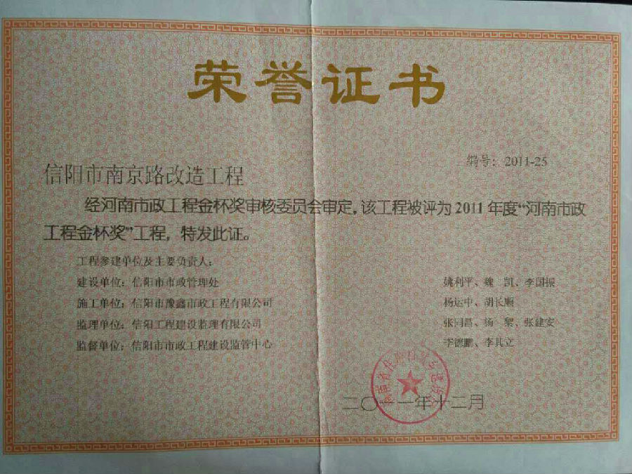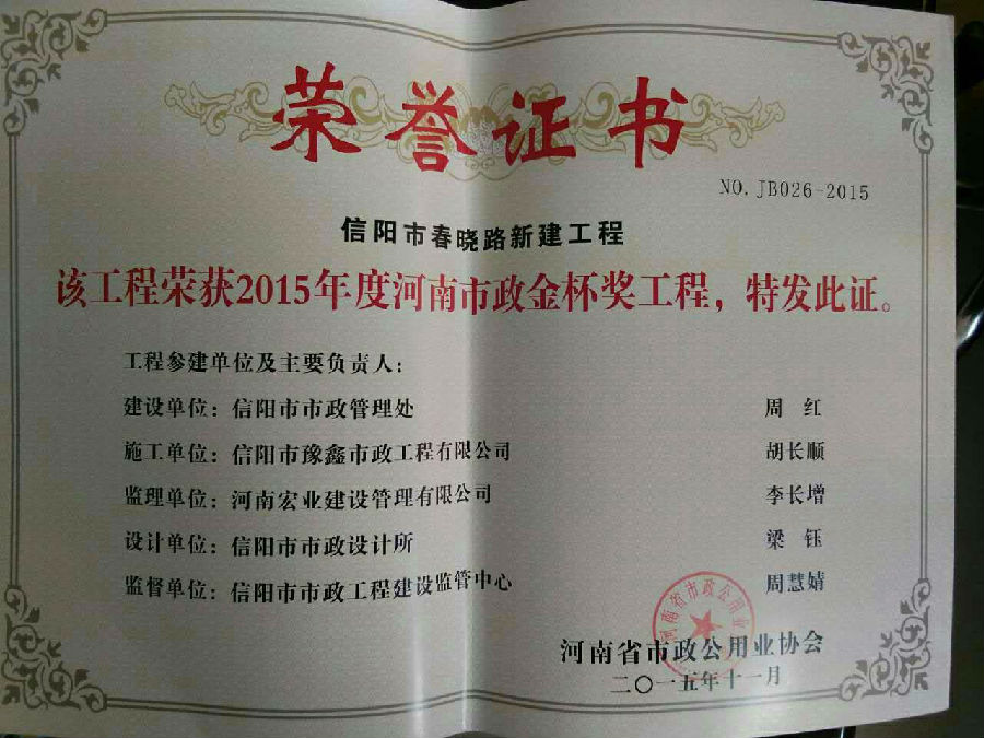 好風(fēng)憑借力,送我上青云。近年來,公司積極參與城市市政基礎(chǔ)設(shè)施建設(shè)施工,積極參與市場競爭,先后承擔(dān)施工了市政府重點(diǎn)工程南京路道路改造工程、春曉路道路改造工程,東方紅大道道路改造工程、龍江東路新建工程等重點(diǎn)民生工程,其中南京路道路改造工程被省建設(shè)廳評為“中州杯”, 春曉路和東方紅大道道路改造工程被省建設(shè)廳評為“省優(yōu)工程”,成為城區(qū)一道道亮麗的風(fēng)景線。參與施工了市典范小區(qū)“臺北城上城”、“恒大名都”以及師范學(xué)院、職業(yè)技術(shù)學(xué)院、交警支隊(duì)和軍區(qū)道路工程,參與施工了雞公山管理區(qū)、南灣管理區(qū)、明港鎮(zhèn)和羅山縣等部分道路小區(qū)工程施工,累計(jì)大小各類施工工程三百余項(xiàng),企業(yè)影響力不斷擴(kuò)大、輻射力不斷增強(qiáng),市場份額不斷提高,企業(yè)信譽(yù)不斷彰顯,為信陽城市建設(shè)做出了積極貢獻(xiàn),為企業(yè)的可持續(xù)發(fā)展插上了騰飛的翅膀。